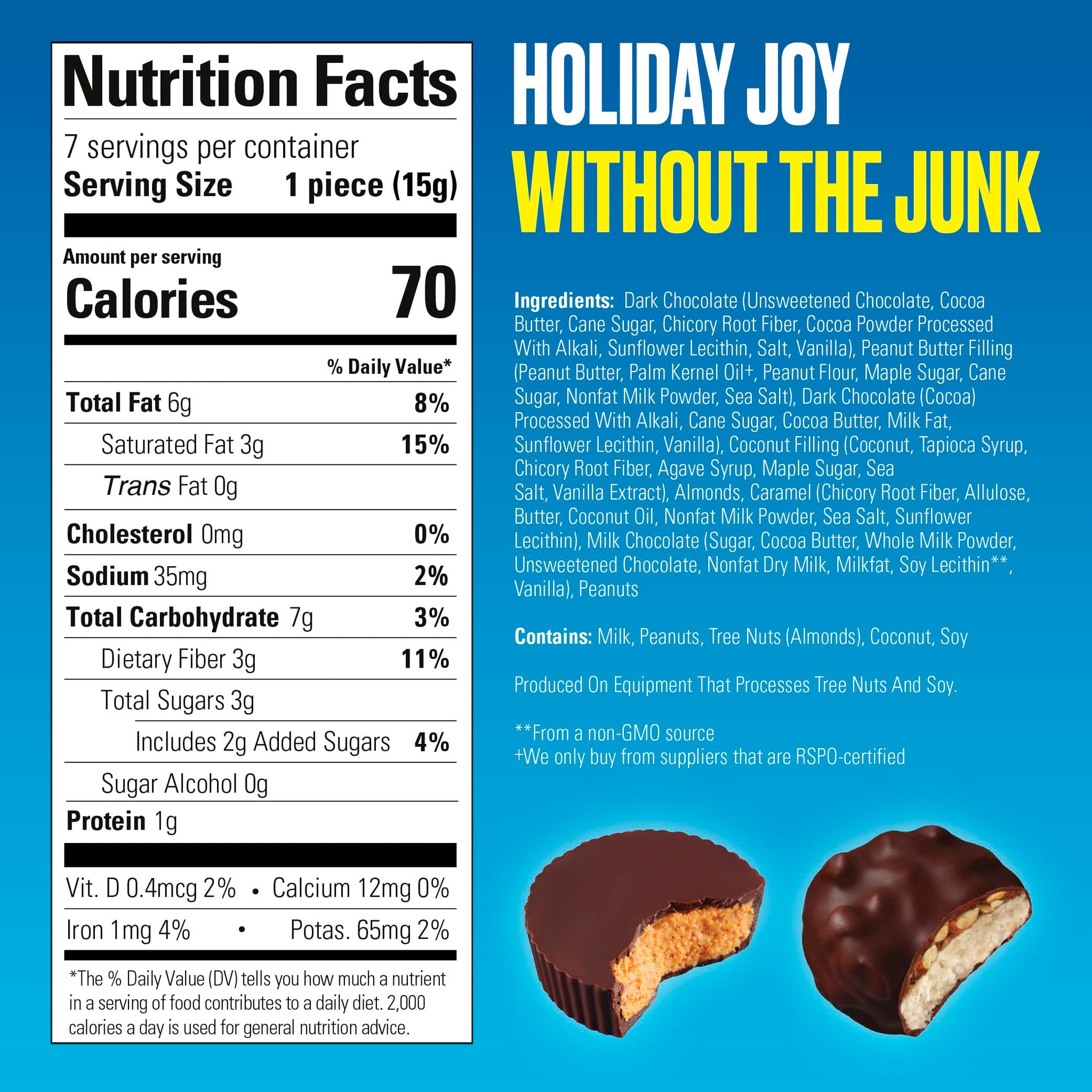 • HOLIDAY JOY WITHOUT THE JUNK: With just 5g of sugar or less per serving, these treats satisfy your sweet tooth without the guilt. Made without artificial sweeteners or sugar alcohols.